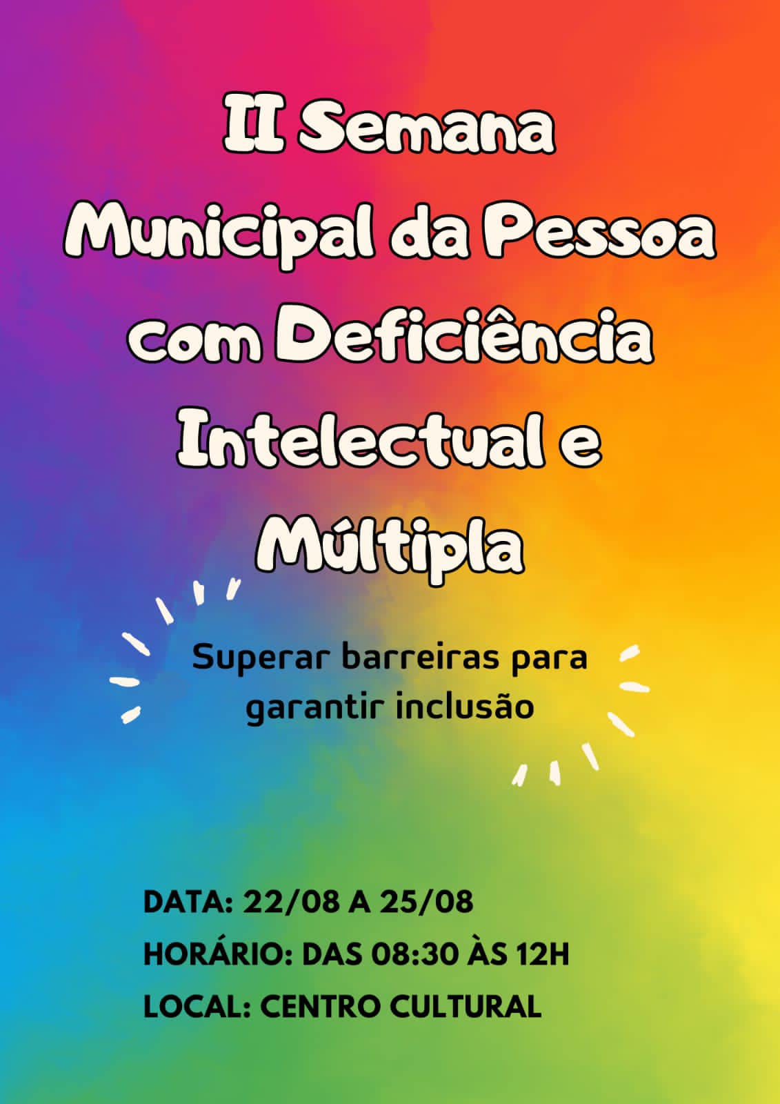 A Prefeitura de Manoel Viana, através da Secretaria de Saúde, em parceria com a Secretaria de Educação, Turismo, Cultura e Desporto, realizará de 22 a 25/08 a II Semana Municipal da Pessoa com Deficiência Intelectual e Múltipla. Com o tema “Superar barreiras para garantir a inclusão” , as atividades ocorrerão no Centro de Cultura, das 8h30min às 12h, com a realização de palestras e formações ministradas por especialistas.