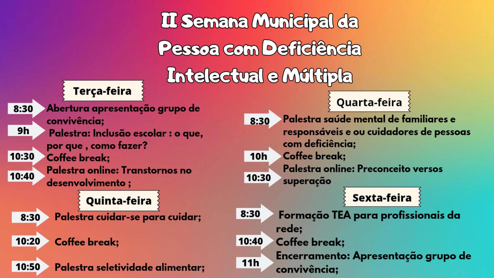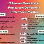 O principal objetivo do evento é conscientizar a sociedade sobre as necessidades específicas de organização social e de políticas públicas para promover a inclusão das pessoas com deficiências. Acompanhe a programação completa da II Semana da Pessoa com Deficiência Intelectual e Múltipla de Manoel Viana.