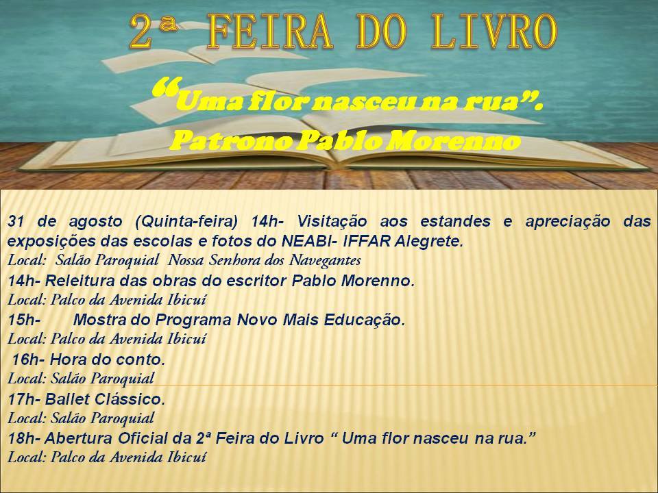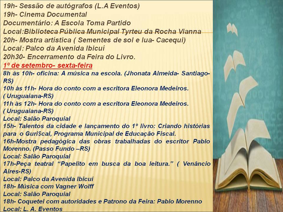 Programação da 2° Feira do Livro de Manoel Viana Educação Notícias 9 de Agosto, 201722 de Maio, 2019Assessoria de comunicação Nos dias 31 de agosto e 1° de setembro de 2017, Manoel Viana será palco da 2° Feira do Livro. Programação da 2° Feira do Livro de Manoel Viana Programação da 2° Feira do Livro de Manoel Viana Programação da 2° Feira do Livro de Manoel Viana Programação da 2° Feira do Livro de Manoel Viana Imprimir Página Compartilhe:
