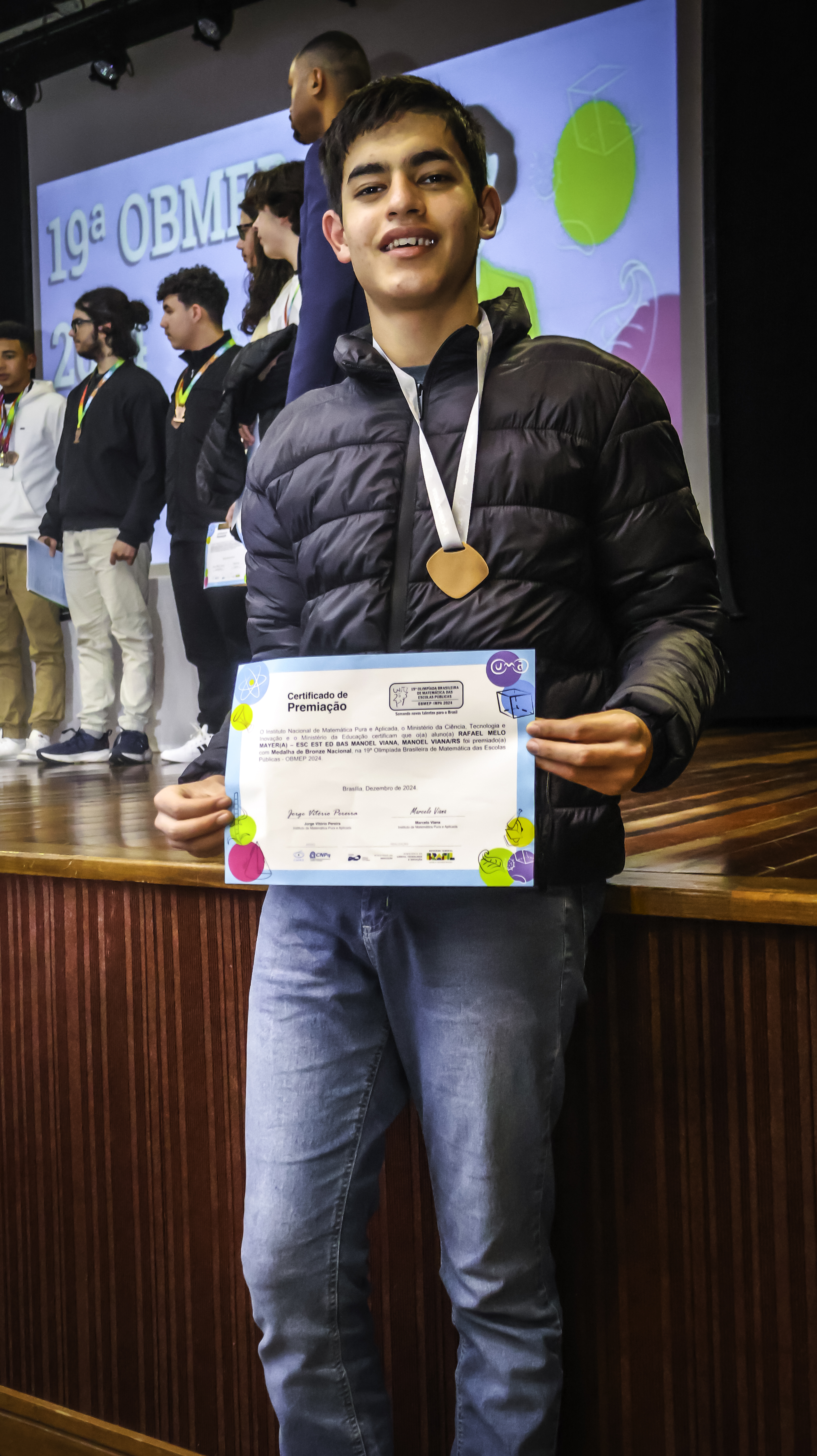 Os alunos André Espelocin Leguissamo, da EMEB Alberto Pasqualini e Rafael Melo Mayer, EEEB Manoel Viana, receberam respectivamente medalha de bronze estadual e medalha de bronze nacional. O evento ocorreu na Fundação Universidade do Rio Grande com a presença de alunos de diferentes regiões do estado. Na região de abrangência da premiação, participaram mais de 100 mil alunos, sendo que apenas em torno de 200 foram premiados, onde neste seleto grupo estão inclusos os dois alunos da rede de ensino de Manoel Viana.